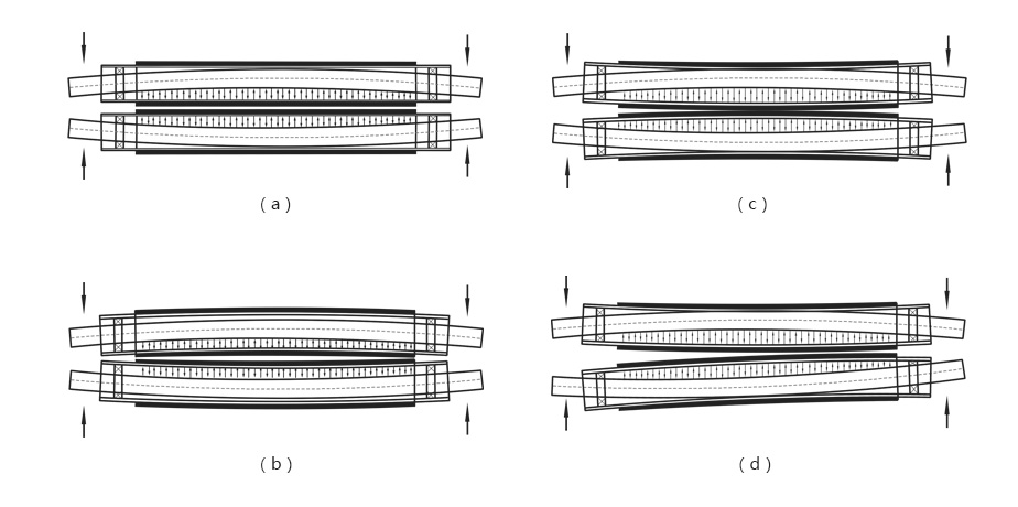 本產品供純棉、化纖及混紡織物浸軋染料、樹脂等工藝介質,并使保持一定的均勻軋余率,供后工序處理之用。(3)如果軋輥兩端氣壓載荷不等,那么氣壓較大端的線壓力會大于另一端。如圖(d)所示,軋染時會出現一邊深,而另一邊淺。